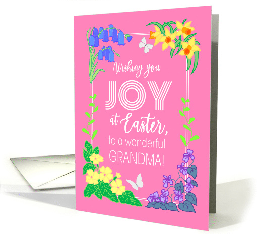 | Artist Notes: | A pretty Easter Card for your grandmother with a border of spring flowers, including primroses, bluebells, daffodils and violets, with two white butterflies hovering, all on a bright pink background. The front cover message, in white lettering, is, 'Wishing you JOY at Easter, to a wonderful GRANDMA!'. The inside message is just a suggestion and you can easily change it or delete it altogether if you wish |