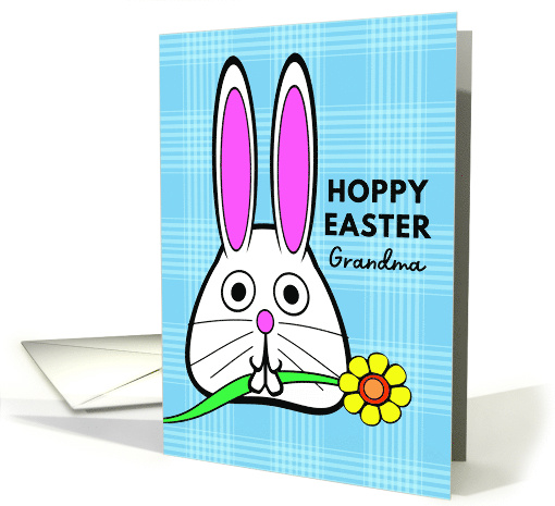 Artist Notes: | Hoppy Easter Grandma, Easter greeting card for a grandmother, grandma. Card has a digital illustration of a cute white rabbit with cartoon like features and black outlines. Powder-blue plaid pattern fills in the background. |