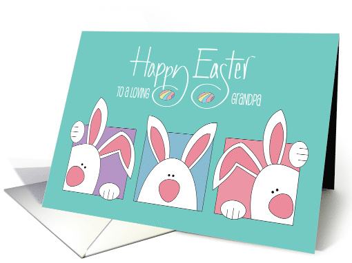 Won't your Grandpa be delighted with this Easter card that is a reminder of how much he is loved? The wording, at the top of this fun and loving teal Easter card says "Happy Easter" - "To a loving Grandpa". Below a trio of white bunnies are trying to search to the hidden Easter eggs, a little early, but everyone can see their huge pointed ears exploding out in all directions and they are finding it hard to stay hidden. The little decorated eggs they are looking for are snuggled down into some of the swooping letters of the phrase "Happy Easter". The card's inside wording says "Happy Easter to a very special Grandpa, with lots of love, from some-bunny who loves you!"