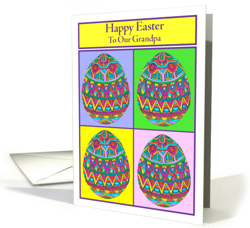 Framed in white, Happy Easter Egg Quartet presents four brightly colored and intricately ornamented Easter Eggs within a thin purple frame set below a similarly framed yellow banner announcing your springtime wishes. This card is derived from my drawing done initially with watercolor and ink pens.