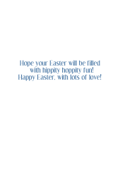 "Hoppy Easter" is the white hand lettered wording, below the chubby green and beige spotted toad on this Easter card for your great grandson. Decorated striped Easter eggs of pink, blue, green, yellow and white cover his hind feet and on his side is an Easter basket filled with smaller eggs that match the weaving of the basket. On the top of the frog's head are a set of pink and white bunny ears and a little yellow chick, making him ready for the holiday. "Great Grandson" is written to the left side of the yellow bird that sits atop one of the bunny ears. The inside wording says "Hope your Easter will be filled with hippity hoppity fun! Happy Easter, with lots of love!"