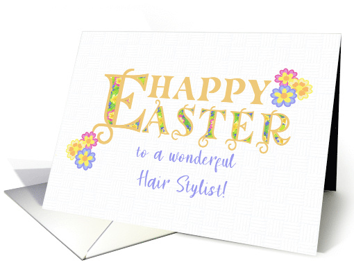 A stylish Easter greeting card for your hair stylist with gold-effect outlines to the letters, some filled with a primrose pattern. The front cover greeting is 'HAPPY EASTER' followed by 'to a wonderful Hair Stylist!' in blue handwriting script. There are clusters of pink, blue and yellow primrose heads in the bottom left-hand and top right-hand corners, all on a lightly textured white background. The inside message is just a suggestion which you can easily change or delete if you wish.
