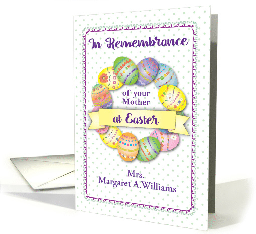 | Artist Notes: | Give this custom name remembrance Easter card to someone who lost their mother. The background is light green polka dot and white with a wreath of decorated eggs, and a yellow banner. The headlines are purple. Two borders in magenta and light green surround the wreath and headlines. The custom name is placed at the bottom of the card. You may change the inside message, if you wish. ©Gail Pepin |