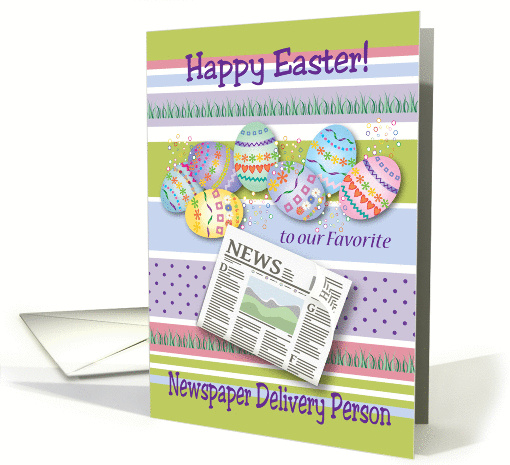 | Artist Notes: | This is an Easter card for a newspaper delivery person, featuring decorated eggs, and a newspaper on a pastel background. Newspaper clip art courtesy of Open Clip Art Library. You can change the inside message at checkout, if you wish. 092511 |