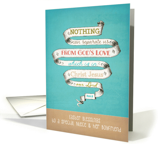 | Artist Notes: | This trendy retro Christian Easter card features a vintage banner (thank you, graphicsfairy) with a synopsis of different bible verses (Romans 8) on a teal and kraft paper color background. You can edit text inside card. Custom requests welcome. |