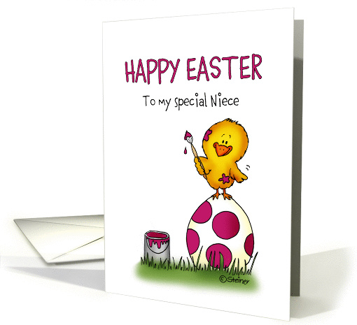 Humorous Easter Card for your Niece - cute chick is coloring Egg
