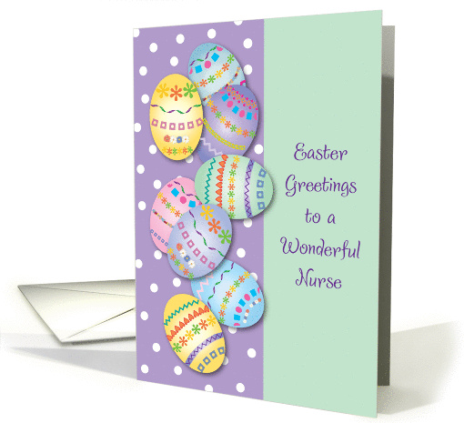 | Artist Notes: | Send this colorful Easter card to nurse, featuring decorated eggs, pastel background, and polka dots. You can change the inside message at checkout, if you wish. 092111 |