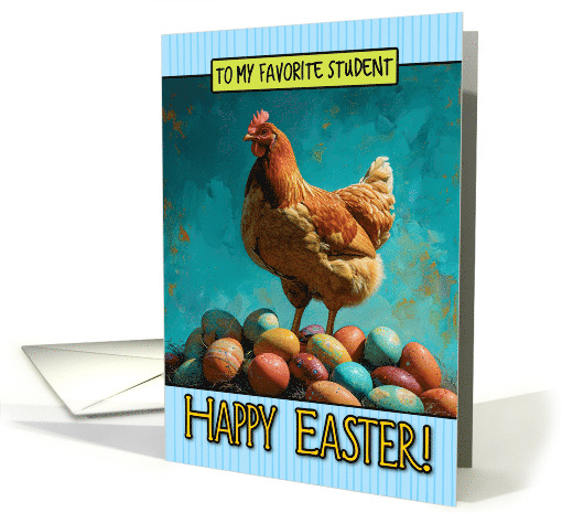 | Artist Notes: | A productive hen stands proudly amidst many painted easter eggs painted in the style of vibrant colorism and the text "to my favorite student" in a lime-green box, and "Happy Easter!" in yellow on a light-blue striped background. A festive card to send to your wonderful student for Easter. |
