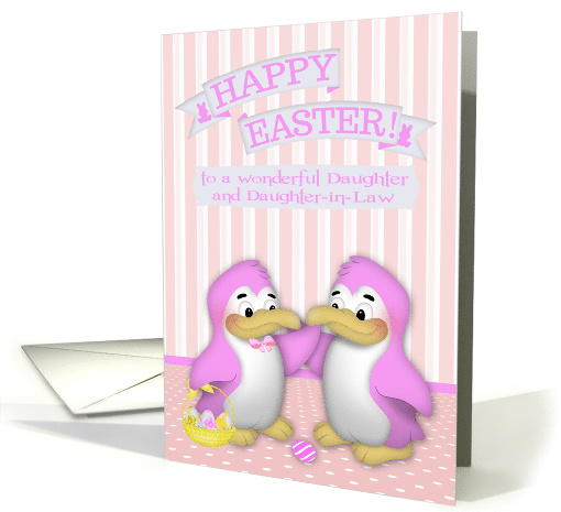 Wish your wonderful daughter and daughter-in-law a Happy Easter with a card featuring two adorable penguins, one is wearing a cute bow and holding a basket of decorated Easter eggs standing on a polka dot floor against a pink striped background with pink text on a banner decorated with bunnies. Design by Laurie Schneider, elements by La Galerie de Jackie, Digital Designs by Elena. Over millions of years, a penguin's wings have evolved and instead of flying they work as flippers to help them swim. There are many different species of penguins.