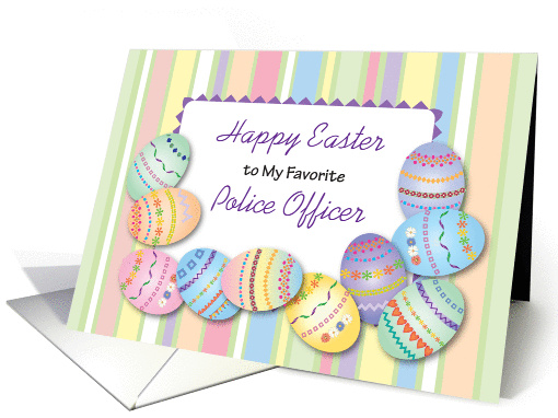 | Artist Notes: | This is an Easter card for a police officer, featuring colorful decorated eggs and a pastel striped background. You may change the inside message at checkout, if you wish. |