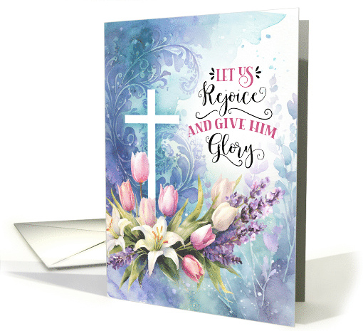 This card reminds us that Easter is a time of joy, beauty and rejoicing. The true Christian message symbolized by the Easter cross is complimented by spring tulips and lilies to wish anyone a happy and blessed Easter.