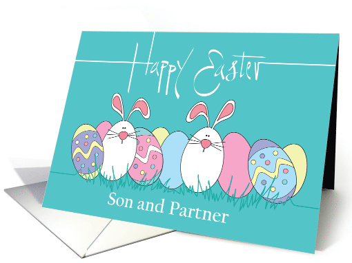 This delightfully fun card is the perfect way to say Happy Easter this year to your Son and his Partner. A row of yellow, blue, pink and highly decorated Easter eggs flow across the aqua card, with two unusual additions to the group. Two eggs are pure white, with large, round pink noses and long, long white and pink ears that look alot like the ears of bunnies. Are they bunnies or eggs? Hand lettered wording, across the top of the card, wording says "Happy Easter". "Son and Partner" are written below the eggs and bunnies. The inside wording of the card says "Wishing you both a wonderfully joyful Easter!"