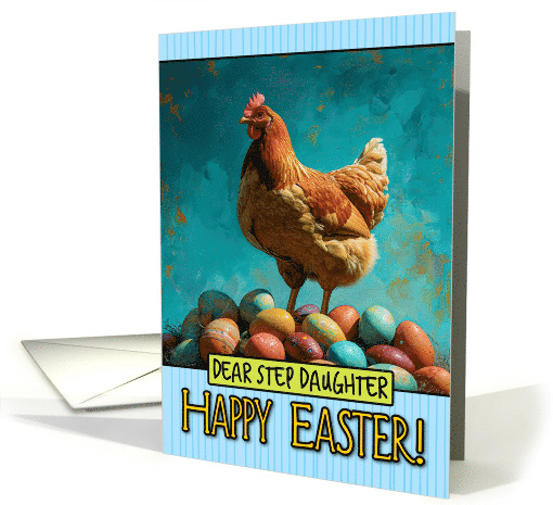 | Artist Notes: | A productive hen stands proudly amidst many painted easter eggs painted in the style of vibrant colorism and the text "dear step daughter" in a lime-green box, and "Happy Easter!" in yellow on a light-blue striped background. A festive card to send to your wonderful step daughter for Easter. |