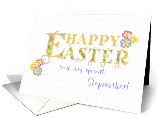 A stylish Easter greeting card for your step mother, with gold-effect outlines to the letters, some filled with a primrose pattern. The front cover greeting is 'HAPPY EASTER' followed by 'to a very special Stepmother!' in blue handwriting script. There are clusters of pink, blue and yellow primrose heads in the bottom left-hand and top right-hand corners, all on a lightly textured white background. The inside message is just a suggestion which you can easily change or delete if you wish.