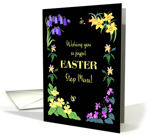 A pretty Easter card for your stepmother, with a border of spring flowers on a black background. There are bluebells, wild daffodils, wood violets and primroses in the corners and wood anemones at the sides, with bumble bees hovering near the flowers. The front cover greeting is, 'Wishing you a joyful EASTER Step Mom!', in a handwritten font and a bold capital letters.', in pale yellow lettering, all on a black background. The inside message is just a suggestion and you can easily change it or delete it if you prefer a 'blank inside' card.