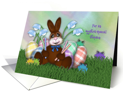 | Title: | Easter for a Stepson Adorable Bunny, with Eggs, Flowers and Frogs |