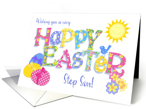 A pretty, floral Easter card for your stepson. This 'word art' card has 'Happy Easter' in large letters that are filled with primrose patterns and coordinating, polka dot and check patterns in pink, blue, yellow and light green. There are three colourful Easter eggs in the bottom left corner and a smiling sun in the top right corner, a cluster of primroses in the bottom right corner and a little blue bird, singing cheerfully on top of the final letter 'e'. The whole front cover greeting is, 'Wishing you a very Happy Easter Step Son!'. And the inside message is just a suggestion and you can easily personalize it or delete it altogether.
