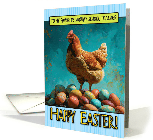 | Artist Notes: | A productive hen stands proudly amidst many painted easter eggs painted in the style of vibrant colorism and the text "to my favorite sunday school teacher" in a lime-green box, and "Happy Easter!" in yellow on a light-blue striped background. A festive card to send to your wonderful sunday school teacher for Easter. |