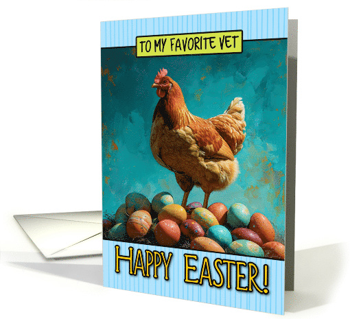 | Artist Notes: | A productive hen stands proudly amidst many painted easter eggs painted in the style of vibrant colorism and the text "to my favorite vet" in a lime-green box, and "Happy Easter!" in yellow on a light-blue striped background. A festive card to send to your wonderful veterinarian for Easter. |