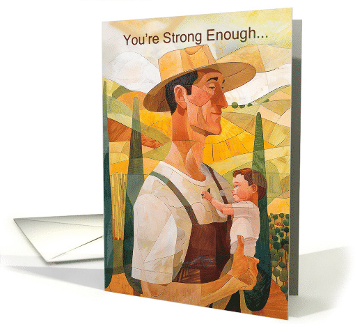 This is part of a series of paintings used as cards for Father's Day. This patchwork of color invokes the countryside and rural life. A strong man holding his son. The idea is that he is strong enough to be a great dad.