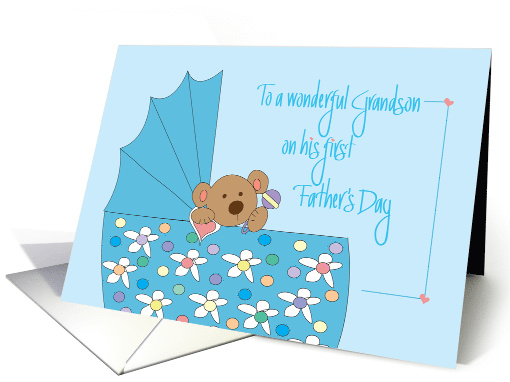 Your Grandson has a brand new little baby boy and is now celebrating being a Daddy for his very First Father's Day this year. This delightful card will be one that will both wish him a Happy First Father's Day and let him know how very special both he and his baby son are to you. The wording is elegantly hand lettered, in turquoise, with the words "To a wonderful Grandson on his first Father's Day". A baby brown bear peeks out of his blue decorated bassinette, with one paw over the heart on it and one paw holding a rattle, below the words. The card's inside wording says "Wishing you a loving and joyful 1st Father's Day as you celebrate the miracle of your little baby boy."