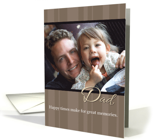 | Artist Notes: | Customizable Father's Day Photo Card for Dad / Fatherfeatures large area for you to place your own photograph. Dad in pretty script font in beige layered over the photo with black drop shadow. Happy Times Great Memories in white over warm gray/brown vertical striped background. |