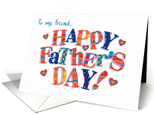 A bold, eye-catching greeting card for your friend on Father's Day. 'Happy Father's Day' fills most of the front cover with outsize letters, filled with brightly coloured patterns, chevrons, polka dots and stripes in red, blue, green, yellow and orange. There are small decorative hearts in the same colours in the four corners of the text and one in the centre. 'To my Friend' is in matching blue informal script in the top left hand corner, all on a faux lightly textured white background. The inside message is just a suggestion and you can easily change it or delete it if you wish.