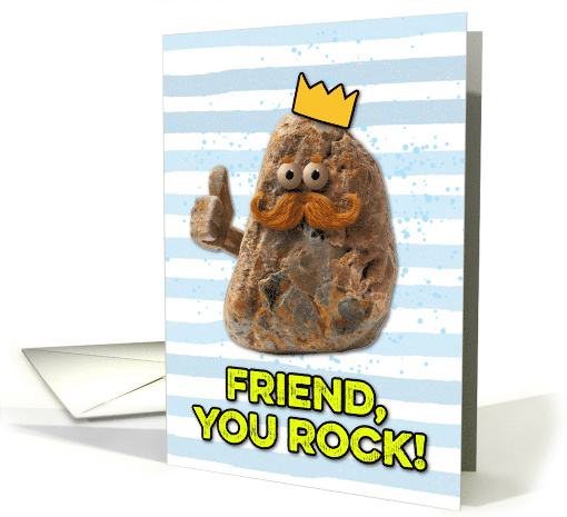 A rock with a ginger moustache, a yellow crown, and a thumbs up on a blue watercolor striped pattern background with blue splatter effect and the text "friend, you rock!" in lime-green. A sweet and fun card to send to that wonderful friend for Father's Day.