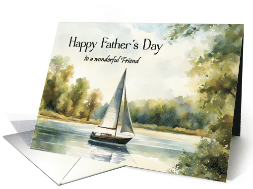 Artist Notes: | Happy Fathers Day for Friend. Serene watercolor painting of a sailboat on a sunlit lake surrounded by trees, with classic mixed typography. Some of the artwork was AI generated, all other elements of the design were created and edited by the artist. |