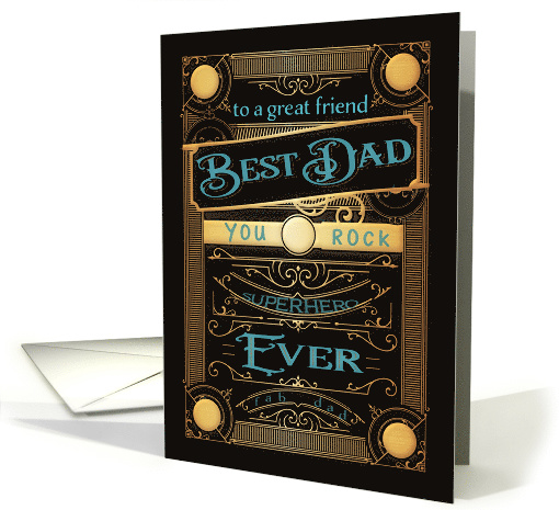 A lovely retro card for your special friend, to wish him a Happy Father's Day. Black, Gold (gold-effect) and teal/mint blue are the main colors. Ornate vintage frames, banners, swirls and buttons. You can customize message inside the card.