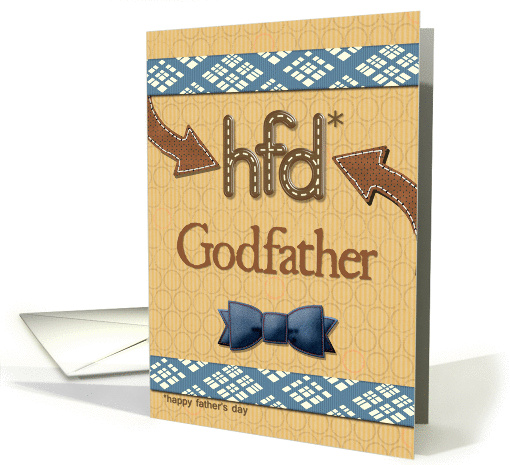 | Artist Notes: | This fun Happy Father's Day Godfather card features a masculine scrapbook style design of a big blue bow tie, blue and cream patterned ribbons, and a humorous abbreviation (hfd) with an asterisk to direct the receiver to fine print that says "Happy Father's Day." Design also includes brown arrows with white stitching and a background of circles and stripes. Ribbons are digitally created. |