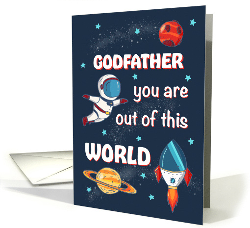 | Artist Notes: | This fun space-themed greeting card has a dark navy blue background scattered with twinkling stars and glowing cosmic dust. The design includes cheerful illustrations: a smiling astronaut in a white suit with red gloves, a red planet, a yellow ringed planet resembling Saturn, a rocket blasting off, and turquoise stars scattered throughout. The overall tone is playful and whimsical, ideal for children celebrating a beloved godfather. |