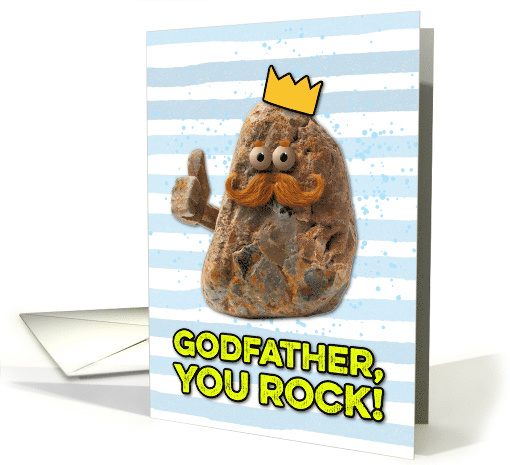 | Artist Notes: | A rock with a ginger moustache, a yellow crown, and a thumbs up on a blue watercolor striped pattern background with blue splatter effect and the text "godfather, you rock!" in lime-green. A sweet and fun card to send to that wonderful godfather for Father's Day. |