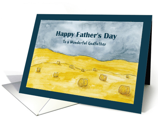| Artist Notes: | On Father's Day, celebrate with this rustic card your wonderful Godfather, adorned with watercolor hay bales scattered across fields beneath a textured, cloud-filled sky. |