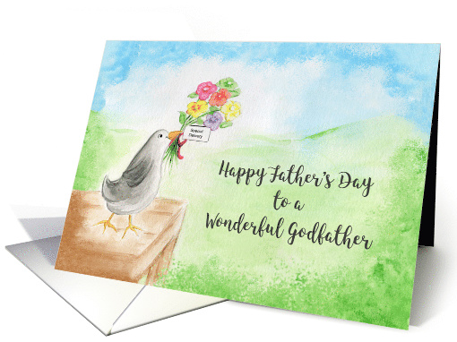 | Artist Notes: | Wish a wonderful godfather a happy Father's Day that is as special as he is to you with this heartfelt greeting card featuring a cheerful digitized watercolor image of a sweet little gray bird holding a bouquet of colorful flowers in its beak in front of a bright background of green hills and blue sky. |
