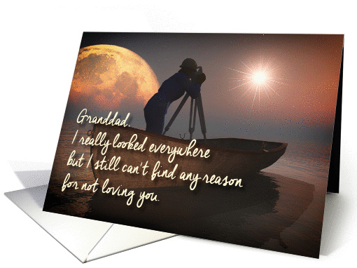 A whimsical fantasy Father's Day card for your Granddad. You are searching everywhere for a reason not loving him in a boat with the moon and stars at the background. Inside there is a text which you can customize to something very personal.