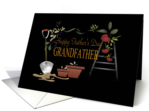 For the grandfather who loves to garden. Shovel,spade,plant pots and a silver ladder. Garden tools with an embossed effect on a black background