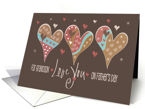 This is a Father's Day card your Grandson will really enjoy receiving from you this year. He'll enjoy the way the large hand lettered wording, at the bottom of the card, jumps out of the chocolate brown background, with the words "Love You", letting him know how much he is loved. Extra wording, on either side of the large wording, says "For Grandson on Father's Day". Three ornate hearts crown the top of the card, wearing their outfits of stripes, swirly twirls, round polka dots and multi-sized hearts in colors of caramel brown, aqua blue and terracotta red. The inside wording of the card says "Joy and happiness to a wonderful Grandson, with love."