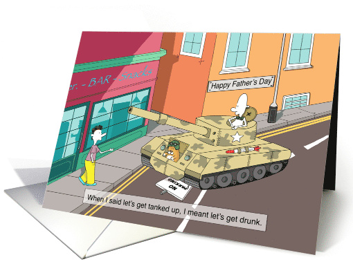 This is a funny card with Duncan and his friend, Duncan has got confused with meeting up for a drink, when his friend said let’s get tanked up, meaning let’s go for a drink and get drunk, Duncan turned up in a tank!