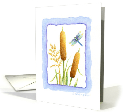 A colorful dragonfly golden brown cattails. Wonderful card for a Happy Father's Day greeting. It will brighten his day! Inside Verse: Wishing you the simple pleasures of nature on the special day. Relax, take it easy, and enjoy! Happy Father's Day. Original watercolor by Audrey Ascenzo.❤️