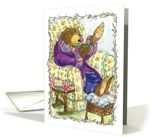 Send Father's Day greetings with a papa bear in his favorite chair set inside a whimsical twiggy border. This is an ink and watercolor painting.