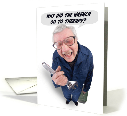 Send your dad a "dad joke" telling funny older man holding a wrench and cracking himself up when you wish him a Happy Father's Day.