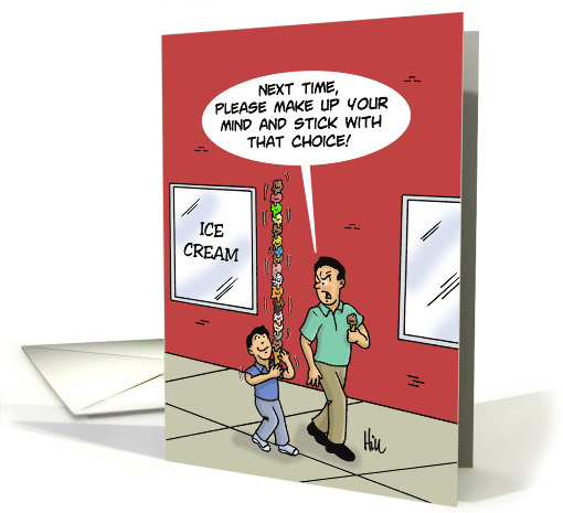 Humorous Father's Day card with a cartoon of a father and son leaving an ice cream store. The boy has many flavors of ice cream on a cone. The father says, Next time, please make up your mind and stick with that choice! Inside says, Happy Father's Day