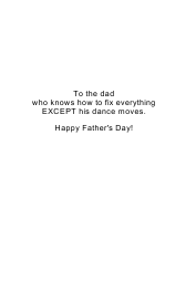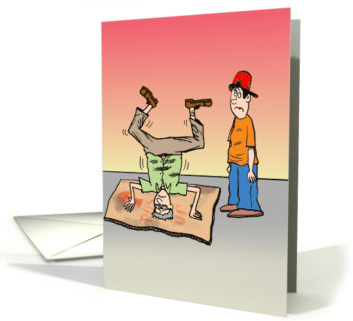 A Happy Father's Day greeting card featuring a cartoon illustration of a silly dad doing a breakdancing headspin move on cardboard as his embarrassed son looks on in disappointment.