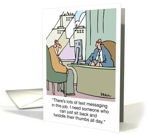 Father's Day Humor. A man at a job interview sits before the man conducting the interview. The man conducting the interview is holding a smartphone and says, There's a lot of text messaging in this job. I need someone who can just sit back and twiddle their thumbs all day. Inside reads, You're thumbody special! Happy Father's Day. Thanks for checking out my greeting cards. More cards: http://www.greetingcarduniverse.com/community/store.asp?store_id=2337&gcu=42744787710&mid=cwu Search: "Cornered by Mike Baldwin+books" to see Cornered books on Amazon.