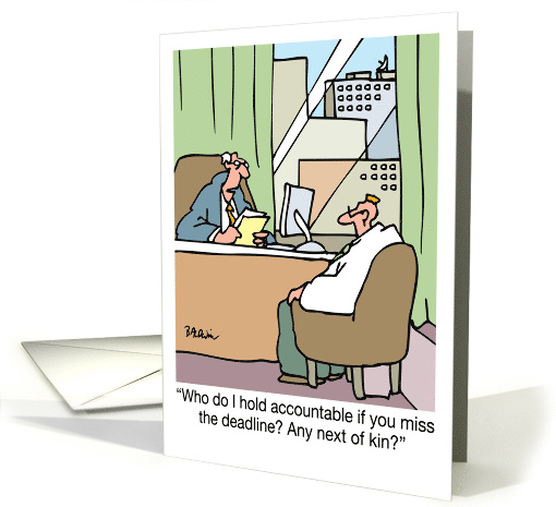 Father's Day. A man sits across from his boss who is holding a report and who asks, Who do I hold accountable if you miss the deadline? Any next of kin? Inside reads, I kin always count on you Happy Father's Day! Thanks for checking out my greeting cards. More cards: http://www.greetingcarduniverse.com/community/store.asp?store_id=2337&gcu=42744787710&mid=cwu Cornered Books at: https://www.amazon.com/-/e/B007G2B9BO My daily cartoon: https://www.gocomics.com/cornered