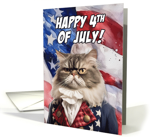| Artist Notes: | A patriotic Persian Cat dressed in stars and stripes on an American flag watercolor background with the text 'Happy 4th of July!'. The perfect card to send to for a cat mom or dad to celebrate the birthday of America. |