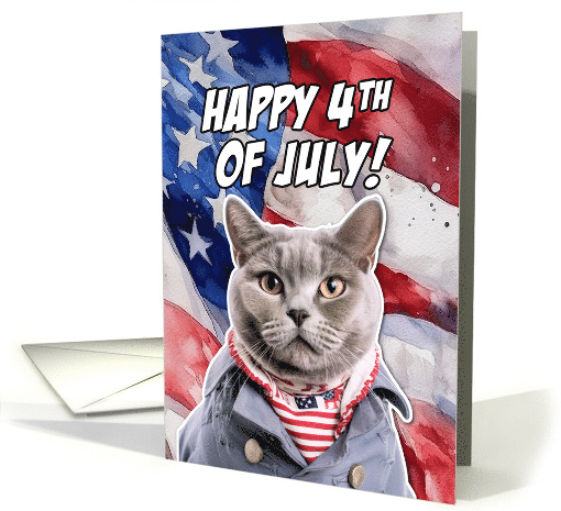 | Artist Notes: | A patriotic British Shorthair kitty dressed in stars and stripes on an American flag watercolor background with the text 'Happy 4th of July!'. The perfect card to send to for a british shorthair cat mom or dad to celebrate the birthday of America. |