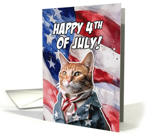| Artist Notes: | A patriotic ginger kitty dressed in stars and stripes on an American flag watercolor background with the text 'Happy 4th of July!'. The perfect card to send to for a ginger cat mom or dad to celebrate the birthday of America. |
