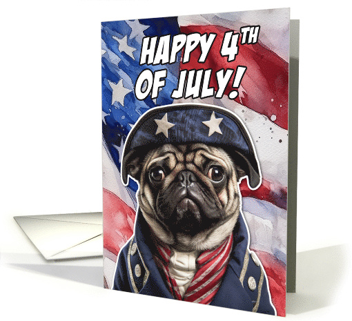 Artist Notes: | A patriotic Pug dressed in stars and stripes on an American flag watercolor background with the text 'Happy 4th of July!'. The perfect card to send to for a Pug mom or dad to celebrate the birthday of America. |